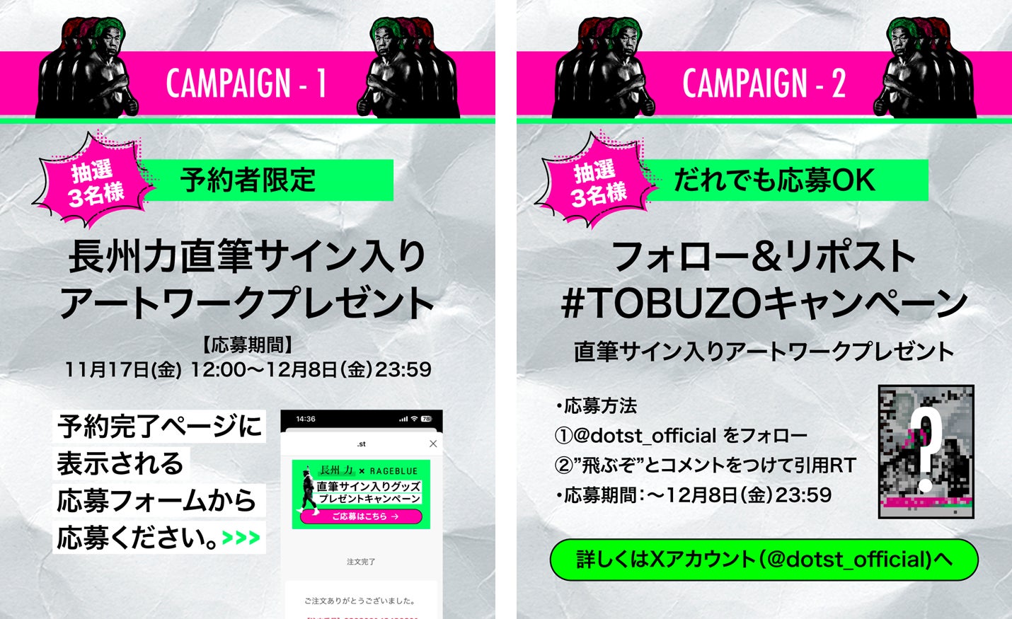 今回は、20代の男女をターゲットとする「RAGEBLUE(レイジブルー)」とコラボし、長州さんが数多く残してきた“名言”をモチーフとしたアイテム全6型が登場。サイズはS、M、Lだけでなく、3XLの長州力サイズも展開!11月17日(金)12:00よりドットエスティにて予約受付がスタートします。さらに、長州さんのサイン入りアートワークが当たるプレゼントキャンペーンを2種類実施します。