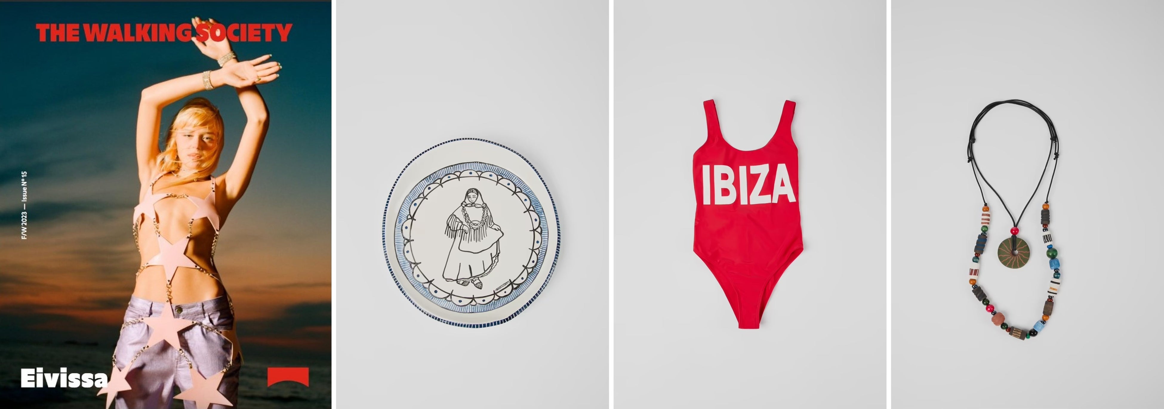 (左から)”The Walking Society” magazine、Pagesa ceramic plate、Vintage "IBIZA" swimsuit、Two traditional necklaces
